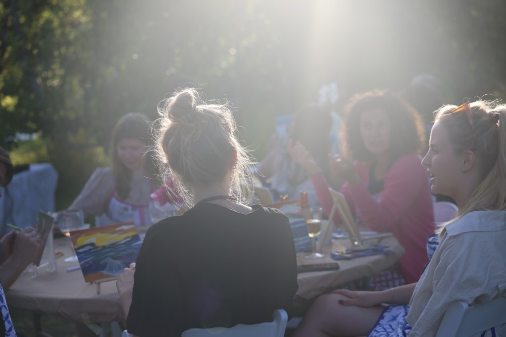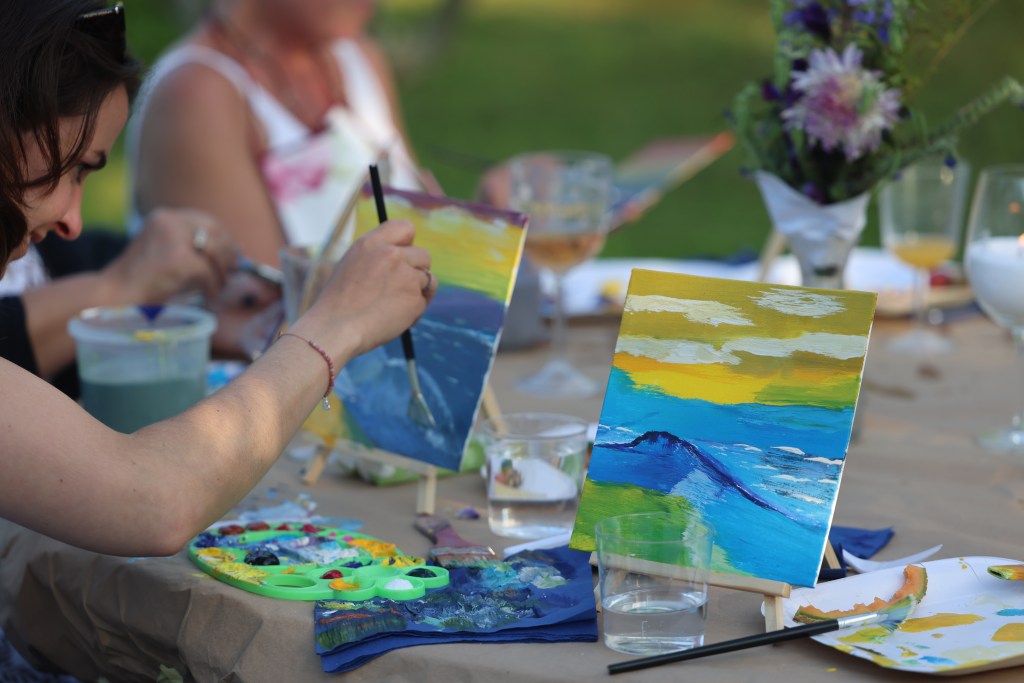 We had a wonderful night drinking, eating, laughing and painting sea-scapes under the guidance of the world famous artist – Bob Ross.